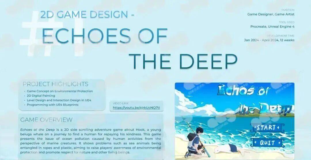 她的作品集从独立游戏到材质研究,全景展开。例如她的主项目之一《Echoes of the Deep》,是一款以“海洋环保”为背景的沉浸式独立游戏,玩家在其中扮演潜水员,解救被困的海洋生物,并通过改造装置清理污染物。